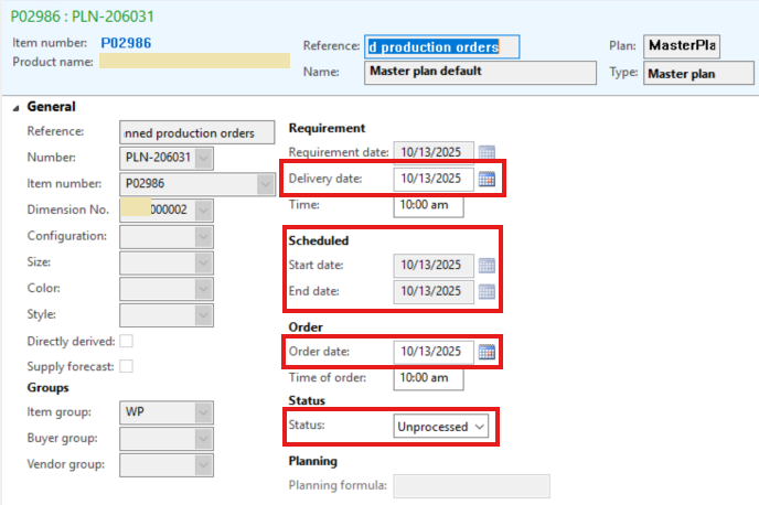 – Status – Kế hoạch sản xuất mới tạo sẽ có trạng thái là Unprocessed