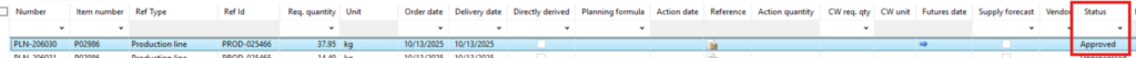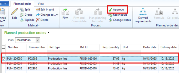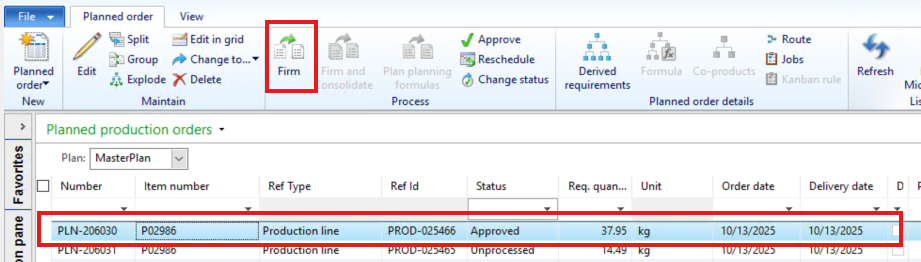 Khi gần đến ngày sản xuất, bộ phận sản xuất vào chọn kế hoạch sản xuất có trạng thái Approved và click vào nút Firm để chuyển kế hoạch thành production order để bắt đầu chuẩn bị cho việc thực hiện.