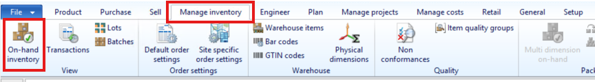 Sau khi chọn một mặt hàng cụ thể trong danh sách, người dùng vào tab Manage inventory trên action pane và chọn On-hand inventory. Khi đó, hệ thống sẽ hiển thị màn hình On-hand Inventory với các cột số lượng thể hiện trạng thái tồn kho tại thời điểm xem dữ liệu.